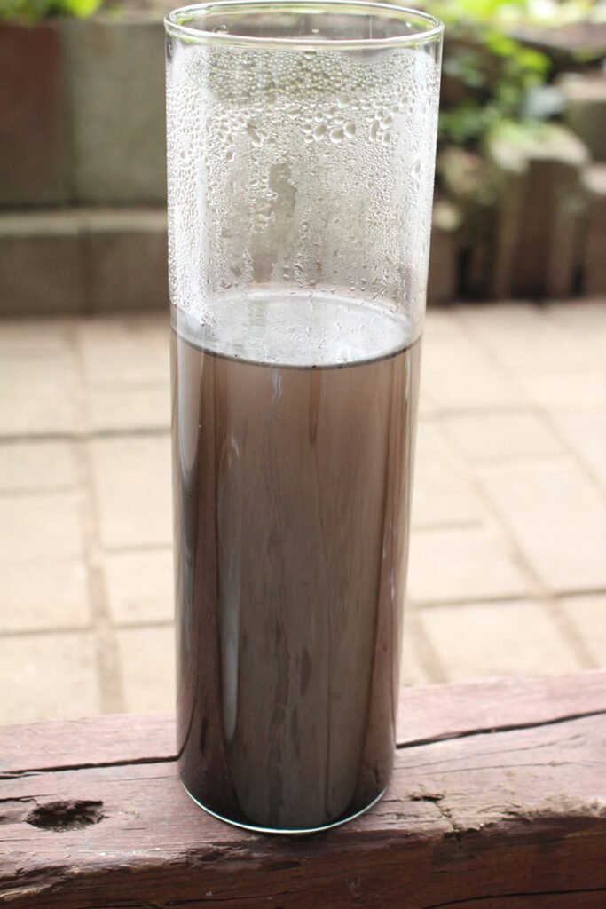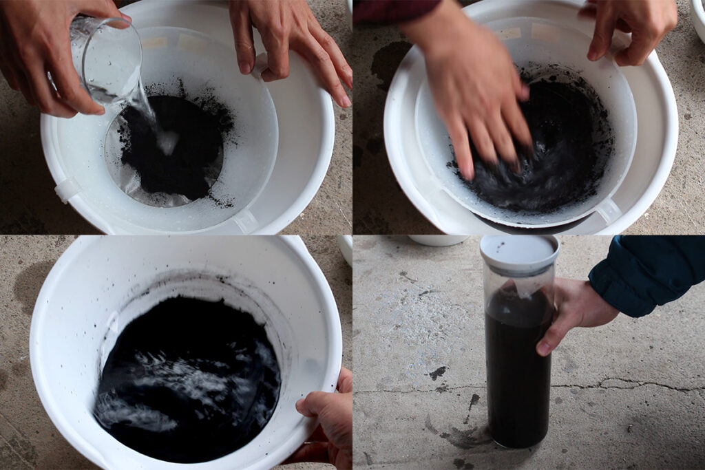 やがて顔料が沈むので、上澄みの水を捨てて、新たに精製水を投入し撹拌、そして顔料が沈むのを待つという工程を繰り返す。細かく砕いている顔料が沈むまでに何日もかかるが、その間に不純物も水に溶け出しているのだと思うことにする。