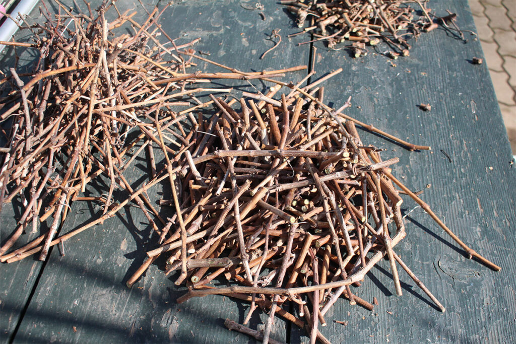 剪定は1年の間に伸びた若枝を中心に切ると思う。やや太くなった堅く古い枝も切り落とすこともあるが、わたしは細目の、赤みがかった、若い枝というか蔓を使っている。その方がやわらかい炭ができると思う。節の部分など堅そうなところも切り落としているが、たぶんそこまでする必要はないと思う。