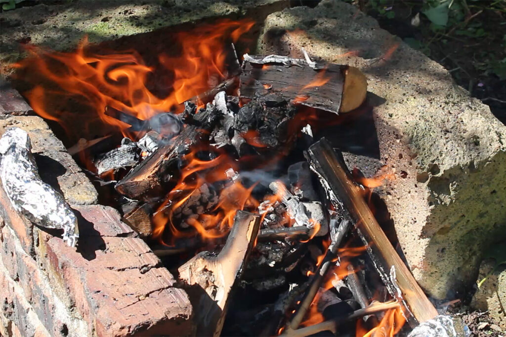 ブロックを組んで竈のようなものをつくり、中に先ほどのダッチオーブンを入れ、周りで薪を燃やした。