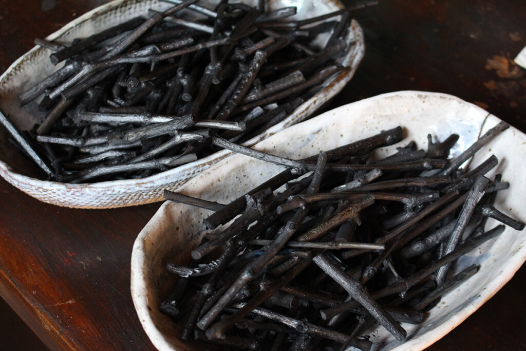 このブドウの蔓を粉砕せねばならないが、ブドウの蔓はとにかく大量に発生するので、このようにたくさんある炭を乳鉢と乳棒で砕くのは現実的ではない。粉砕機にかけるか、石臼などで砕くのがよい。