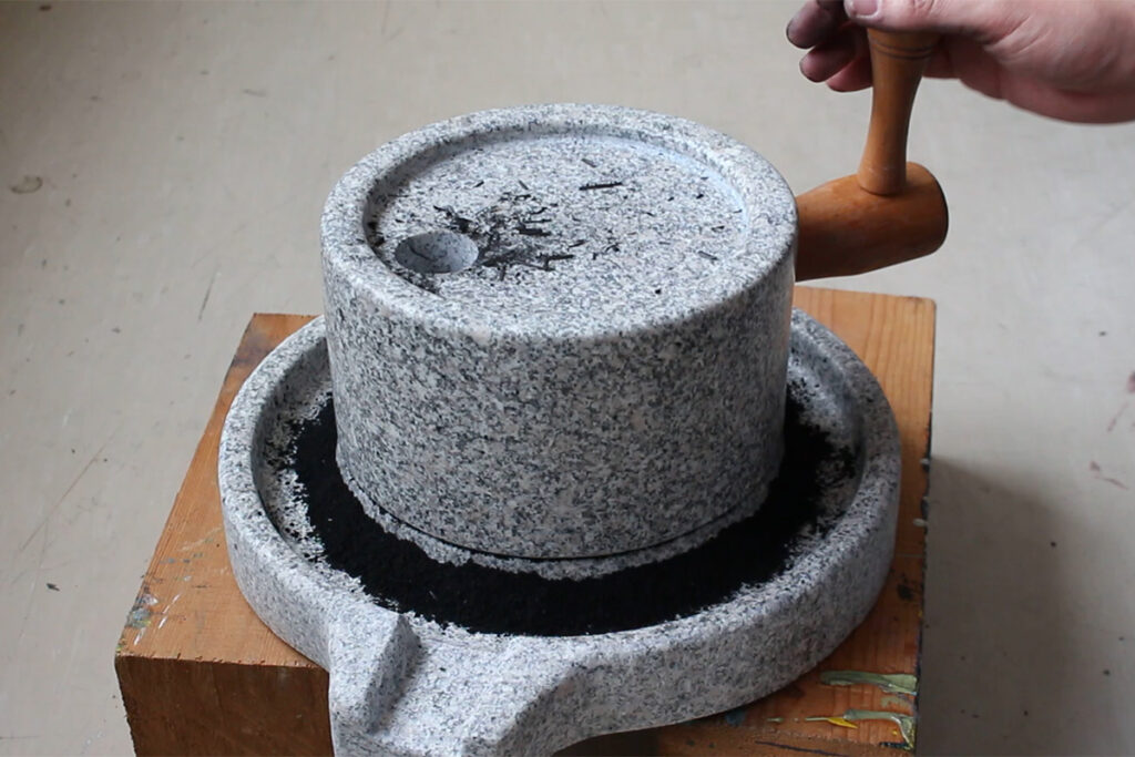 粉砕した顔料は水で流しながら、250~300メッシュのフルイにかけて、粒径と整える。フルイに残った粗い顔料は乳鉢等で細かくした後、再び洗いながらフルイにかける。炭は柔らかいようで意外と堅いので、粗い粒子のものが入っていると絵具を練る際にとても苦労するし、最悪粒が混ざったような状態が解消しないこともある。300メッシュを通るぐらいにしておいた方が後々楽であろう。さらに水で洗浄うするというのも大事である。炭素以外の何かヤニのような色が取れたりして綺麗になることが多い。植物由来の炭顔料はカリウムを含むことが多く、よく水に浸けて溶かしておかないと、アルカリ性に傾く傾向がある。ブドウの皮などの房の部分を使用した場合はより多くのカリウムが含まれていると思った方がよい。カリウムを溶かす目的であれば、お湯で洗浄した方がよく溶けるという話も聞く。水は蒸留水を使う。水道水にはカルシウム、マグネシウムなど様々のミネラルが含まれており、それらは蒸発すると白っぽい垢となって残るものである。黒顔料には致命的なものといえる。とはいえ、日本の水道水は軟水なので、ものすごく影響があるというほどでもないが、硬水の地域は特に注意したい。